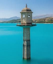 Keywords: watchtower lake turquoise water lighthouse impoundment dam spain basin mountains hills trees landscape architecture building old tower cc0
