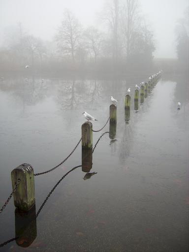 Keywords: water birds perched fog wildlife reflection calm nature wooden posts