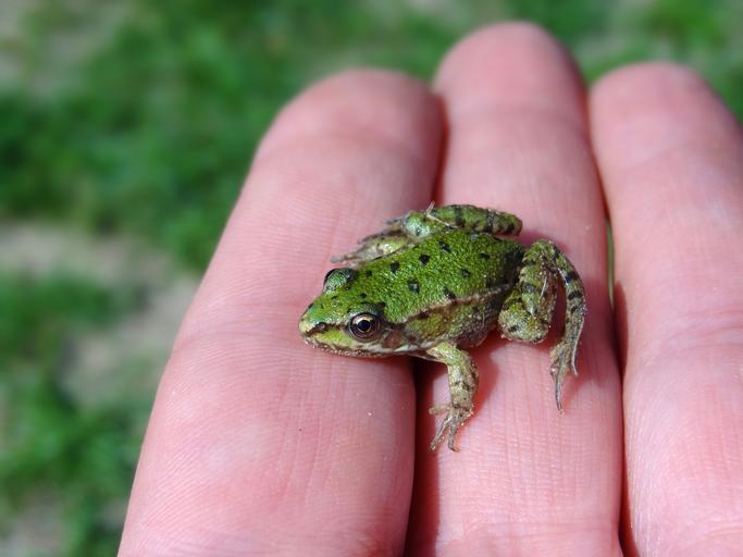 Keywords: water frog frog small green frog lake pond pelophylax nature summer protection of species nature conservation hand tiny amphibians