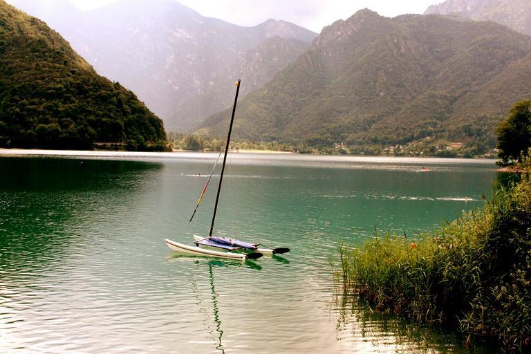 Keywords: water lake boot sailing boat mast wood reed mountains sky italy ledro landscape nature wave reflections romantic bank rock