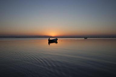 Keywords: water lake sea ocean boat fisherman sunset orange glow dusk twilight reflection calm peaceful quiet scene