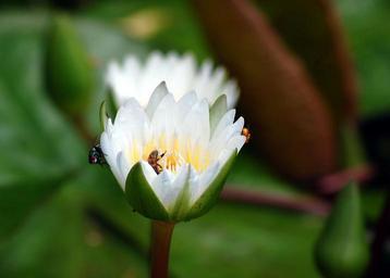 Keywords: water lily lilies white petal floral blossoms insects flies blooms decorative ornamental aquatic water flowering plants green leaves floating green background bright exotic gardens gardening