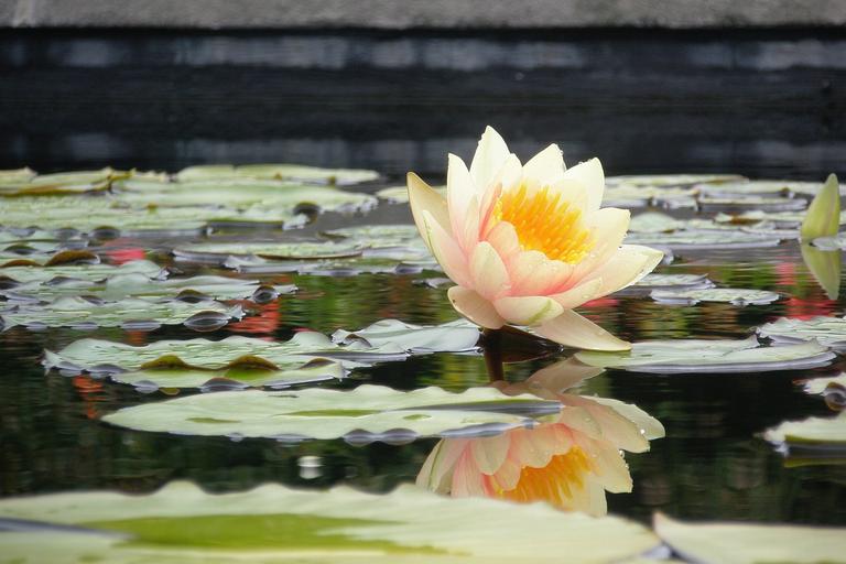Keywords: water lily lily pad flower reflection water pond blossom yellow bloom nature wet