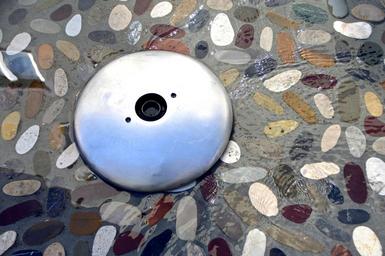 Keywords: water spout water dispenser gargoyle water way unknown object pedestrian zone pebbles trickle graphic design material collection