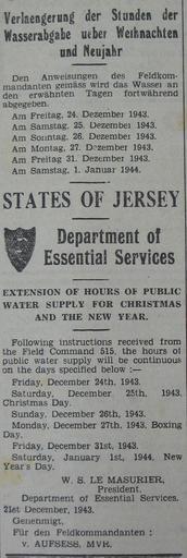 | Keywords: Water supply hours Christmas New Year Jersey 1943.jpg Avis Allemand dé duthant l'Otchupâtion d'Jèrri German military decree/notice from Occupation of Jersey PD-GermanGov own photo of old document 2013-04-09 10 35 34 Man vyi 1943 in Jersey Christmas in Jersey Public services of Jersey German military orders in Jersey Christmas 1943 |