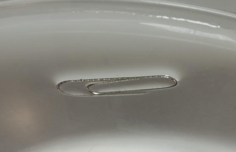 Keywords: Water surface tension 2.jpg en Demonstration of surface tension - a paperclip floating on water Own Kaldari 2009-03-11 Surface tension Paperclips