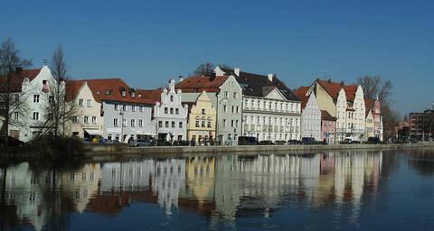 Keywords: water waters mirroring nature mood atmosphere light sun channel building landshut bavaria germany river