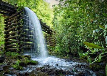 Keywords: waterfall landscape mill spillway forest outdoors scenic water trees peaceful natural foliage logs stream cascade flowing