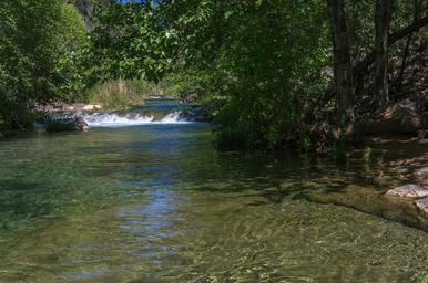 Keywords: arizona coconino national forest coconinonationalforest forest service forestservice fossil creek fossilcreek k20d national forest nationalforest pentax k20d pentaxk20d red rock ranger district redrockrangerdistrict tonto national forest tontonationalforest usfs waterfall trail waterfalltrail canyon desert forest hiking outdoors spring springtime trail camp verde campverde united states unitedstates landscape water creek outdoor A large, natural waterfall on Fossil Creek is the destination of an easy, one mile hike on Waterfall Trail. A large, deep pool at the base of the fall is a popular swimming hole. Fossil Creek produces 20,000 gallons of water a minute from a series of springs at the bottom of a 1,600 foot deep canyon. This permanent water source has created a stunningly beautiful, green riparian zone rich with flora and fauna at the bottom of this arid canyon in Arizona's high desert. Travertine deposits encase whatever happens to fall into the streambed, forming the fossils for which the area is named. These deposits create deep pools along the length of the creek, providing opportunities to find more secluded swimming holes than the popular pool at the waterfall. Fossil Creek is one of two "Wild and Scenic" rivers in Arizona. This designation was achieved when the Irving power plant was decommissioned, and removal of flume and dam on the creek allowed the creek to flow free. Increasing popularity has led to the Coconino and Tonto National Forests to implement a parking permit reservation system in 2016. Reserved parking permits allow visitors to have a parking spot available in their chosen parking lot. Many visitors drive two or three hours to get to the creek. The final descent to the creek at the bottom of a canyon is on an extremely rough, rocky jeep road. In prior years, the area would often be closed to entry when it reached capacity, and potential visitors would be turned away after the long, difficult drive. Photo by Deborah Lee Soltesz, May 4, 2016. For trail and recreation information, see Fossil Creek, Fossil Springs Wilderness, and the Coconino National Forest. A large, natural waterfall on Fossil Creek is the destination of an easy, one mile hike on Waterfall Trail. A large, deep pool at the base of the fall is a popular swimming hole. Fossil Creek produces 20,000 gallons of water a minute from a series of springs at the bottom of a 1,600 foot deep canyon. This permanent water source has created a stunningly beautiful, green riparian zone rich with flora and fauna at the bottom of this arid canyon in Arizona's high desert. Travertine deposits encase whatever happens to fall into the streambed, forming the fossils for which the area is named. These deposits create deep pools along the length of the creek, providing opportunities to find more secluded swimming holes than the popular pool at the waterfall. Fossil Creek is one of two "Wild and Scenic" rivers in Arizona. This designation was achieved when the Irving power plant was decommissioned, and removal of flume and dam on the creek allowed the creek to flow free. Increasing popularity has led to the Coconino and Tonto National Forests to implement a parking permit reservation system in 2016. Reserved parking permits allow visitors to have a parking spot available in their chosen parking lot. Many visitors drive two or three hours to get to the creek. The final descent to the creek at the bottom of a canyon is on an extremely rough, rocky jeep road. In prior years, the area would often be closed to entry when it reached capacity, and potential visitors would be turned away after the long, difficult drive. Photo by Deborah Lee Soltesz, May 4, 2016. For trail and recreation information, see Fossil Creek, Fossil Springs Wilderness, and the Coconino National Forest.