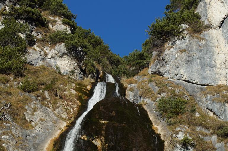 Keywords: waterfall water nature flow bach murmur waters achensee dalfaz rock waterfalls water running mountain stream splash flow motion steep sky blue sunny