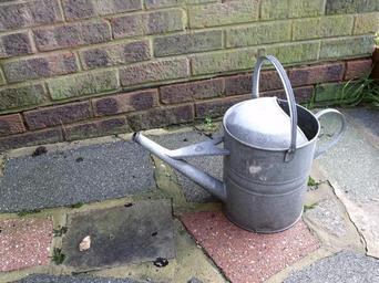 Keywords: watering can pot metal brick wall outdoors water gardening
