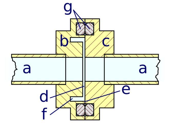 | Keywords: Waveguide-choke-flange-cross-section.svg handSVG ValidSVG en E-plane cross-section of connected choke and gasket/cover waveguide flanges These are the flanges in the photo File Waveguide-choke-flange-UG-1666-U jpg In the cross-section the gap between the flange faces has been exaggerated by a factor of 4 to make it clearly visible Legend a waveguide tubing socket-mounted into b choke flange and c gasket/cover flange d gap between flange faces width exaggerated by factor of 4 e point of contact of flange faces f short at bottom of choke ditch g O-ring gaskets to allow pressurization own Catslash Waveguide flanges SVG electricity |