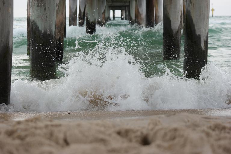 Keywords: waves breaking waves under a pier beach waves waves beach pier sand