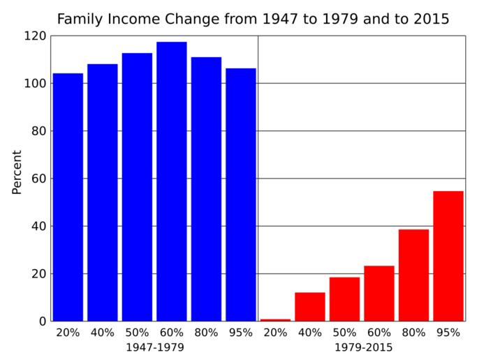 | Keywords: We grew together but now we grow apart.svg  translate yes en From 1947 to 1979 incomes in the United States doubled for all income groups from the bottom 20 to the top 5 but since 1979 income have stagnated for the bottom 20 and only grown slowly for the top 5 Off the chart though is the growth in income of the top 1 which tripled since 1979 growing by 224 Data from US Census https //www census gov/data/tables/time-series/demo/income-poverty/cps-finc/finc-01 html 2016-09-17 own Delphi234 other versions cc-zero Income distribution in the United States |