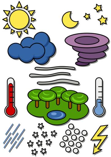 Keywords: weather symbols temperature rain snow lightning sun storm tornado clouds nature trees forest lake