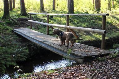 Keywords: web bridge bach water forest transition boardwalk wooden bridge crossing nature river idyll dog animal