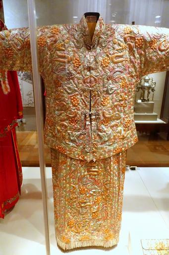 | Keywords: Wedding costume in midi (dense embroidery) style, view 1, with dragon-and-phoenix patterns - Hong Kong Museum of History - DSC00951.JPG en Exhibit in the Hong Kong Museum of History Hong Kong This artwork is old enough so that it is in the public domain Photography was permitted in the museum without restriction 2014-07-27 02 24 04 own Daderot other versions cc-zero Clothing of China in the Hong Kong Museum of History Uploaded with UploadWizard Wedding clothing of China | ||||