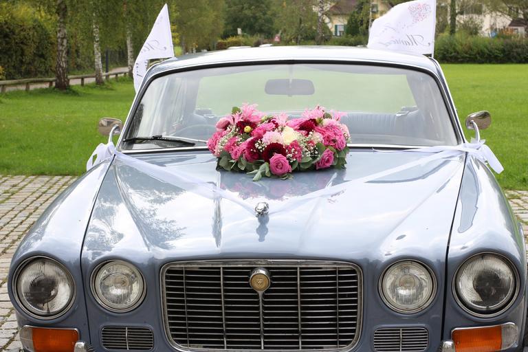 Keywords: wedding romantic celebration marry flowers auto jaguar oldtimer flowers heart decoration