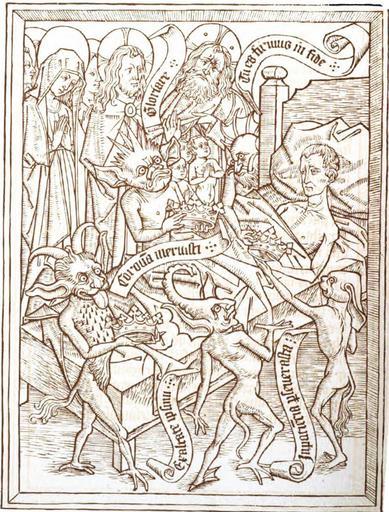 | Keywords: Weigel 07.JPG Artist Gloriare Tu es firmus in fide Coronam meruisti Exalta teipsum In paciencia perseuerasta perseverasti ---- Schriftbänder Sei stolz Du bist stark im Glauben Du hast die Krone verdient Verherrliche dich selbst Du bist in Geduld geübt ---- Banderoles Be proud You are strong in faith You have earned the crown Exalt yourself Persevere in patience Five devils adulate sanctimoniously and offer crowns Mary Christ and God the Father attend the dying man along with saints Three small figures of saved souls at his eye level show that pride can be resisted own PD-old Other versions left thumb Ars moriendi |