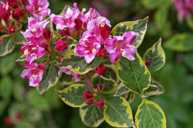 Keywords: weigela bush flowering shrub bi color garden flower bed pink flowering pink blossom bloom hedge flowering hedge garden design bud flower plant spring nature branch leaves bicolor leaves leaf green leaf structure pattern