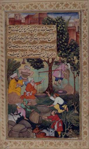 Keywords: Weighing grain, from the Babur-namah.jpg en Almond Harvest from the Babur-namah Mughal period http //warfare2 likamva in/Moghul/Baburnama/Baburnama htm Sur Das PD-Art Uploaded with UploadWizard Baburnama