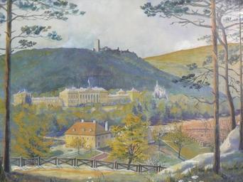 | Keywords: Weilburg Schemel 2.JPG de Aquarell von Schloss Weilburg bei Baden im Hintergrund der Rauheneckkogel mit der Burgruine Rauheneck Aquarell im Haus der Großnichte Frau Dora Berger des Künstlers Rudolf Schemel Rudolf Schemel 1933 Paintings of Baden Lower Austria Schloss Weilburg Baden Burg Rauheneck Baden Rudolf Schemel |