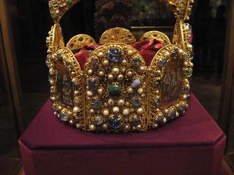 Keywords: Weltliche Schatzkammer Wien (170).JPG Die Reichskrone Westdeutsch 2 H 10 Jahrhundert; das Kronenkreuz einer Hinzufügung des frühen 11 Jahrhunderts; der Bügel aus der Zeit Kaiser Konrads II 1024-1039 ; die rote Samthaube aus dem 18 Jahrhundert Gold Email Zellenschmelz Edelsteine Perlen Stirnplatte H 14 9 cm B 11 2 cm ; Kronenkreuz H 9 9 cm SK Inv -Nr XIII 1 The Imperial Crown Western Germany 2nd half of the 10th century The cross is an addition from the early 11th century; the arch dates from the reign of Emperor Conrad II ruled 1024-1039 ; the red velvet cap is from the 18th century Gold cloisonné enamel precious stones pearls Brow plate H 14 9 cm W 11 2 cm; cross H 9 9 cm SK Inv No XIII 1 Own 2007-10 MyName Gryffindor part of panorama Weltliche Schatzkammer Wien 171 pano jpg Secular and Ecclesiastical Treasury |