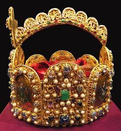 Keywords: Weltliche Schatzkammer Wien (176)pano2.jpg Die Reichskrone Westdeutsch 2 H 10 Jahrhundert; das Kronenkreuz einer Hinzufügung des frühen 11 Jahrhunderts; der Bügel aus der Zeit Kaiser Konrads II 1024-1039 ; die rote Samthaube aus dem 18 Jahrhundert Gold Email Zellenschmelz Edelsteine Perlen Stirnplatte H 14 9 cm B 11 2 cm ; Kronenkreuz H 9 9 cm SK Inv -Nr XIII 1 The Imperial Crown Western Germany 2nd half of the 10th century The cross is an addition from the early 11th century; the arch dates from the reign of Emperor Conrad II ruled 1024-1039 ; the red velvet cap is from the 18th century Gold cloisonné enamel precious stones pearls Brow plate H 14 9 cm W 11 2 cm; cross H 9 9 cm SK Inv No XIII 1 Own 2007-10 MyName Gryffindor Own CSvBibra and Gryffindor 2007 and cleaned up 2009 Image Weltliche Schatzkammer Wien 176 pano jpg Imperial Crown of the Holy Roman Empire Secular and Ecclesiastical Treasury |