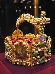 Keywords: Weltliche Schatzkammer Wien (189).JPG Die Reichskrone Westdeutsch 2 H 10 Jahrhundert; das Kronenkreuz einer Hinzufügung des frühen 11 Jahrhunderts; der Bügel aus der Zeit Kaiser Konrads II 1024-1039 ; die rote Samthaube aus dem 18 Jahrhundert Gold Email Zellenschmelz Edelsteine Perlen Stirnplatte H 14 9 cm B 11 2 cm ; Kronenkreuz H 9 9 cm SK Inv -Nr XIII 1 The Imperial Crown Western Germany 2nd half of the 10th century The cross is an addition from the early 11th century; the arch dates from the reign of Emperor Conrad II ruled 1024-1039 ; the red velvet cap is from the 18th century Gold cloisonné enamel precious stones pearls Brow plate H 14 9 cm W 11 2 cm; cross H 9 9 cm SK Inv No XIII 1 Own 2007-10 MyName Gryffindor Imperial Crown of the Holy Roman Empire Secular and Ecclesiastical Treasury |