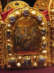 Keywords: Weltliche Schatzkammer Wien (197).JPG Darstellung aus dem Neuen Testament Jesus von zwei Engeln umrahmt Die Reichskrone Westdeutsch 2 H 10 Jahrhundert; das Kronenkreuz einer Hinzufügung des frühen 11 Jahrhunderts; der Bügel aus der Zeit Kaiser Konrads II 1024-1039 ; die rote Samthaube aus dem 18 Jahrhundert Gold Email Zellenschmelz Edelsteine Perlen Stirnplatte H 14 9 cm B 11 2 cm ; Kronenkreuz H 9 9 cm SK Inv -Nr XIII 1 Scene from the New Testament Christ with two angels The Imperial Crown Western Germany 2nd half of the 10th century The cross is an addition from the early 11th century; the arch dates from the reign of Emperor Conrad II ruled 1024-1039 ; the red velvet cap is from the 18th century Gold cloisonné enamel precious stones pearls Brow plate H 14 9 cm W 11 2 cm; cross H 9 9 cm SK Inv No XIII 1 Own 2007-10 MyName Gryffindor Imperial Crown of the Holy Roman Empire Jesus Christ in art Seraphim Pearls in art Cloisonné of Europe Secular and Ecclesiastical Treasury |