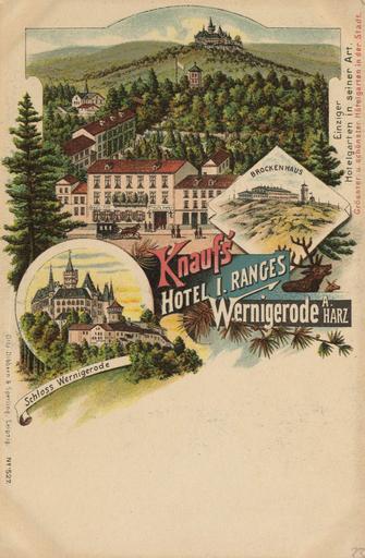 Keywords: Wernigerode Knaufs Hotel AK09645a.jpg Knaufs Hotel in der Burgstraße 49 in Wernigerode Litho mit Blick auf das Hotel zum Schloß und zum Brockenhaus between 1890 1914 PD-old-70-1923 Postcard object history credit line accession number 2000067690X Postcards of Wernigerode Burgstraße Wernigerode |