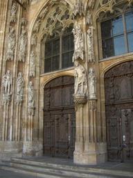 Keywords: west portal portal hauptprtal ulm cathedral gothic pillar statues goal door ornament entwine church door decorated input archway building architecture limestone window tracery