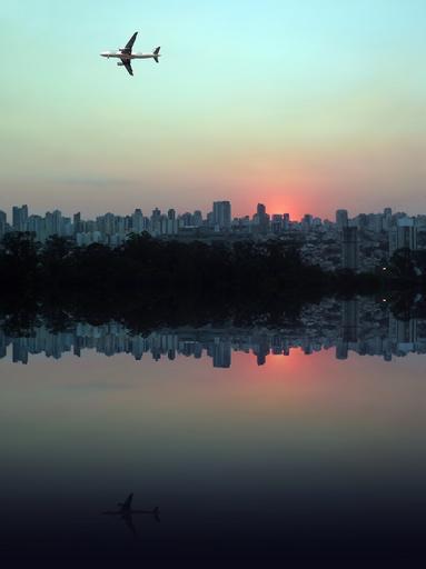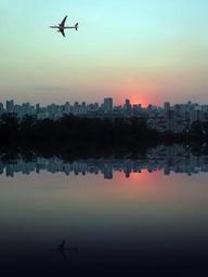 Keywords: west sol eventide birds against light sky city reflection plane lake buildings brazil
