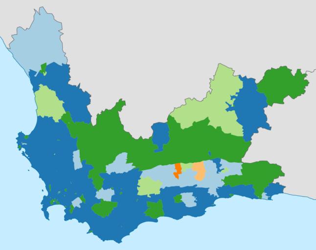 | Keywords: Western Cape provincial election 2014 winner by ward.svg Western Cape the party taking the largest number of votes in the 2014 provincial legislature election A lighter shade indicates a non-majority plurality legend 33a02c African National Congress majority b2df8a African National Congress plurality 1f78b4 Democratic Alliance majority a6cee9 Democratic Alliance plurality ff7f00 Independent Civic Organisation of South Africa majority fdbf6f Independent Civic Organisation of South Africa plurality own Htonl 2014-05-17 2014 South African general election maps Maps of the Western Cape Maps by Htonl Cc-zero |