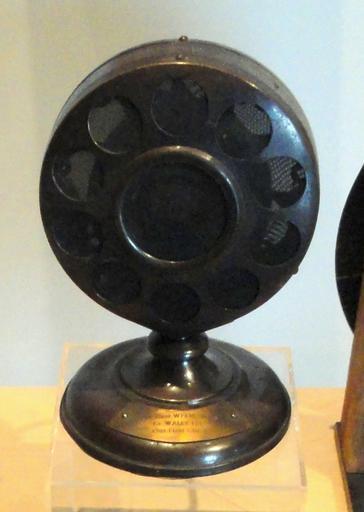 | Keywords: Western Electric double button carbon microphone.jpg carbon microphone in 1B housing used at WFBM the first radio station in Indianapolis Indiana USA from its founding in 1924 The double button microphone was developed around 1921 by Western Electric and was extremely widely used as a broadcast and recording microphone through the 1920s because it had significantly lower noise and harmonic distortion It is often called the ring and spring micrphone as it is often seen in period photos with its cover removed as a small microphone cylinder suspended in the center of a metal ring by springs Carbon microphones consist of a cell containing carbon granules between two electrodes in contact with a diaphragm but they have high harmonic distortion because the change in resistance of the carbon is nonlinear different under compression than under tension The double button design used two carbon cells in contact with the diaphragm on either side They were connected to a battery and center-tapped audio transformer in a push-pull circuit which canceled even-order harmonic distortion The stiff duralumin diaphragm had a small excursion which further reduced distortion and high resonant frequency and air damping which gave it a flatter frequency response However the cost of this higher fidelity was that it had very low output <br /> Caption of label card Announcers at WFBM Indianapolis were using this microphone when the enterprise became Indianapolis' first successful radio station in 1924 Cropped out everything except microphone Chetvorno Radio_equipment_-_Indiana_State_Museum_-_DSC00410 JPG Carbon microphones Western Electric microphones |