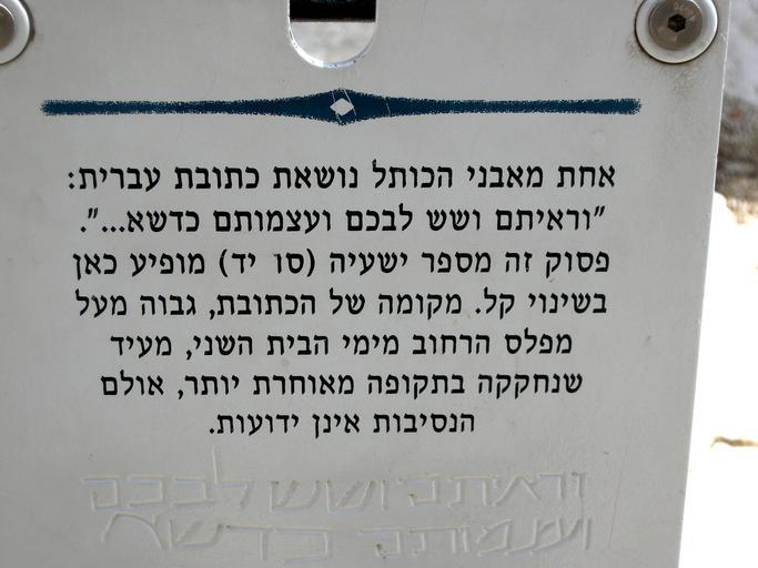 | Keywords: Western Wall3358.JPG Old Jerusalem Western Wall The Isaiah Stone located under Robinson's Arch has a carved inscription in Hebrew from Isaiah 66 14 וראית ושש בכ ועצמותיכ כדשא תפרחנה And when ye see this your heart shall rejoice and your bones shall flourish like an herb אחת מאבני הכות נושאת כתובת עברית וראית ושש בכ ועצמות כדשא פסוק זה מספר ישעיה סו יד מופיע כאן בשינוי ק מקומה ש הכתובת גבוה מע מפ ס הרחוב מימי הבית השני מעיד שנחקקה בתקופה מאוחרת יותר או הנסיבות אינן ידועות own self taken 3 4 2009 Yoav Dothan Own work all rights released Public domain <gallery> File Jerusalem Western Wall Isaiah verse jpg File Jerusalem Western Wall Isaiah verse closeup jpg File Western Wall3358 JPG File Jerusalem Mount of Olives Jericho road Wall Isaiah verse jpg </gallery> Western Wall Ancient graffiti in Israel Ancient Hebrew inscriptions Book of Isaiah Jerusalem Archaeological Park ImageNote 1 242 2088 2845 638 3648 2736 2 copy of the engraved text <br> וראית ושש בכ <br> ועצמות כדשא ImageNoteEnd 1 |