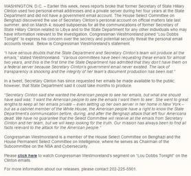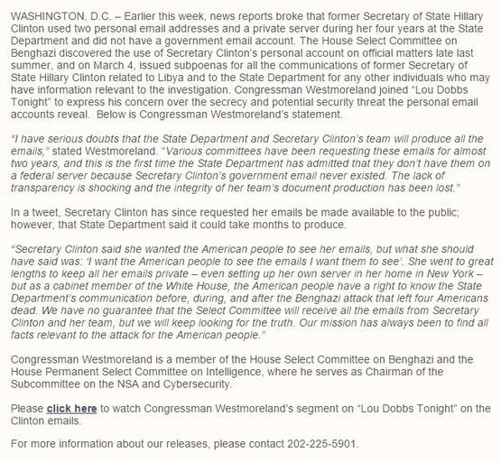 Keywords: Westmoreland Concerned Over Clinton Email Scandal.jpg Westmoreland Concerned Over Clinton Email Scandal Joins Lou Dobbs to Discuss 03/06/15 WASHINGTON D C “ Earlier this week news reports broke that former Secretary of State Hillary Clinton used two personal email addresses and a private server during her four years at the State Department and did not have a government email account The House Select Committee on Benghazi discovered the use of Secretary Clinton ™s personal account on official matters late last summer and on March 4 issued subpoenas for all the communications of former Secretary of State Hillary Clinton related to Libya and to the State Department for any other individuals who may have information relevant to the investigation Congressman Westmoreland joined Lou Dobbs Tonight to express his concern over the secrecy and potential security threat the personal email accounts reveal Below is Congressman Westmoreland ™s statement I have serious doubts that the State Department and Secretary Clinton ™s team will produce all the emails stated Westmoreland Various committees have been requesting these emails for almost two years and this is the first time the State Department has admitted that they don ™t have them on a federal server because Secretary Clinton ™s government email never existed The lack of transparency is shocking and the integrity of her team ™s document production has been lost In a tweet Secretary Clinton has since requested her emails be made available to the public; however that State Department said it could take months to produce Secretary Clinton said she wanted the American people to see her emails but what she should have said was ˜I want the American people to see the emails I want them to see ™ She went to great lengths to keep all her emails private “ even setting up her own server in her home in New York “ but as a cabinet member of the White House the American people have a right to know the State Department ™s communication before during and after the Benghazi attack that left four Americans dead We have no guarantee that the Select Committee will receive all the emails from Secretary Clinton and her team but we will keep looking for the truth Our mission has always been to find all facts relevant to the attack for the American people Congressman Westmoreland is a member of the House Select Committee on Benghazi and the House Permanent Select Committee on Intelligence where he serves as Chairman of the Subcommittee on the NSA and Cybersecurity http //westmoreland house gov/press-releases/westmoreland-concerned-over-clinton-email-scandal-joins-lou-dobbs-to-discuss/ Westmoreland Concerned Over Clinton Email Scandal United States House of Representatives March 6 2015 see also https //web archive org/web/20150308185457/http //westmoreland house gov/press-releases/westmoreland-concerned-over-clinton-email-scandal-joins-lou-dobbs-to-discuss/ archived by the Internet Archive 2015-03-06 United States House of Representatives s Westmoreland Concerned Over Clinton Email Scandal at Wikisource Lynn Westmoreland Hillary Rodham Clinton in 2015 Hillary Rodham Clinton-related documents Hillary Rodham Clinton email use as United States Secretary of State PD-USGov |