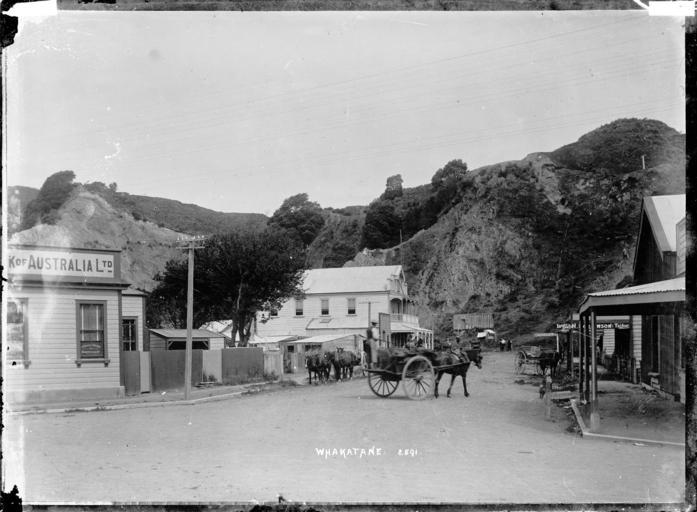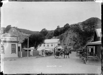 Keywords: blackandwhite monochrome outdoor photo border building architecture black and white Whakatane township and rocky cliffs behind, photographed by William Archer Price circa 1910s. Looks along a street with shops on the right, a horse and cart in the centre, a two-storeyed building with verandahs facing the road, and a corner of the Union Bank of Australia on the left. Inscriptions: Inscribed - Photographer's title on negative -bottom centre: Whakatane. 2591. Quantity: 1 b&w original negative(s). Physical Description: Dry plate glass negative Whakatane township. Price, William Archer, 1866-1948 :Collection of post card negatives. Ref: 1/2-001775-G. Alexander Turnbull Library, Wellington, New Zealand. natlib.govt.nz/records/23231786 Whakatane township and rocky cliffs behind, photographed by William Archer Price circa 1910s. Looks along a street with shops on the right, a horse and cart in the centre, a two-storeyed building with verandahs facing the road, and a corner of the Union Bank of Australia on the left. Inscriptions: Inscribed - Photographer's title on negative -bottom centre: Whakatane. 2591. Quantity: 1 b&w original negative(s). Physical Description: Dry plate glass negative Whakatane township. Price, William Archer, 1866-1948 :Collection of post card negatives. Ref: 1/2-001775-G. Alexander Turnbull Library, Wellington, New Zealand. natlib.govt.nz/records/23231786 |