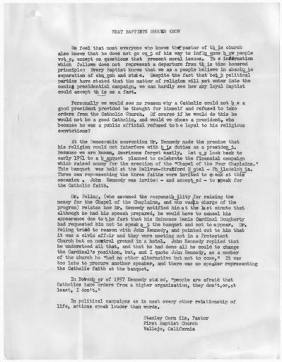 | Keywords: What Baptists Should Know - NARA - 193131.jpg not a federal government work but the work of a California Baptist minister Scope and content Statement which argues that John F Kennedy would take orders from the Catholic Church General notes 193131 Local identifier Kennedy John F John Fitzgerald 1917-1963 John F Kennedy Library NLJFK Columbia Point Boston MA 02125-3398 Record group Collection JFK-KPREP John F Kennedy Pre-presidential Papers 1946 - 1960 Record group ARC 1160 1960 Campaign Files Issues Religious Issue Files of James Wine 1960 compiled 01/01/1960 - 11/30/1960 Series ARC 193127 File unit Anti-Catholic Material 01/01/1959 - 11/30/1960 File unit ARC 193128 Variant control numbers NAIL Control Number NLK-KPREP-RIFJW-ANTICATHOLIC-11BBB Other versions <gallery> File What_Baptists_Should_Know_-_NARA_-_193131 tif tif File What_Baptists_Should_Know_-_NARA_-_193131 jpg jpg </gallery> NARA-cooperation PD-USGov Documents related to John F Kennedy Vallejo California |