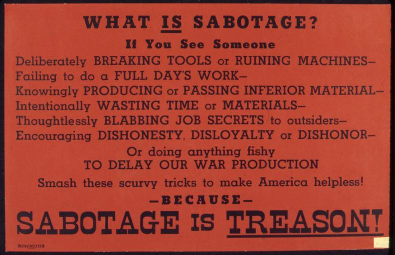 | Keywords: What is sabotage^ Sabotage is treason^ - NARA - 535191.jpg Scope and content General notes 535191 Local identifier 179-WP-1341 Office for Emergency Management War Production Board 01/1942 - 11/03/1945 Still Picture Records Section Special Media Archives Services Division NWCS-S National Archives at College Park 8601 Adelphi Road College Park MD 20740-6001 other date circa 1942 1943 Record group Record Group 179 Records of the War Production Board 1918 - 1947 Record group ARC 508 War Production Board compiled 1942 - 1943 Series ARC 533858 File unit File unit ARC Variant control numbers NAIL Control Number NWDNS-179-WP-1341 Other versions <gallery> File What_is_sabotage _Sabotage_is_treason _-_NARA_-_535191 tif tif File What_is_sabotage _Sabotage_is_treason _-_NARA_-_535191 jpg jpg </gallery> NARA-cooperation PD-USGov World War II propaganda Sabotage Treason World War II posters from the United States |
