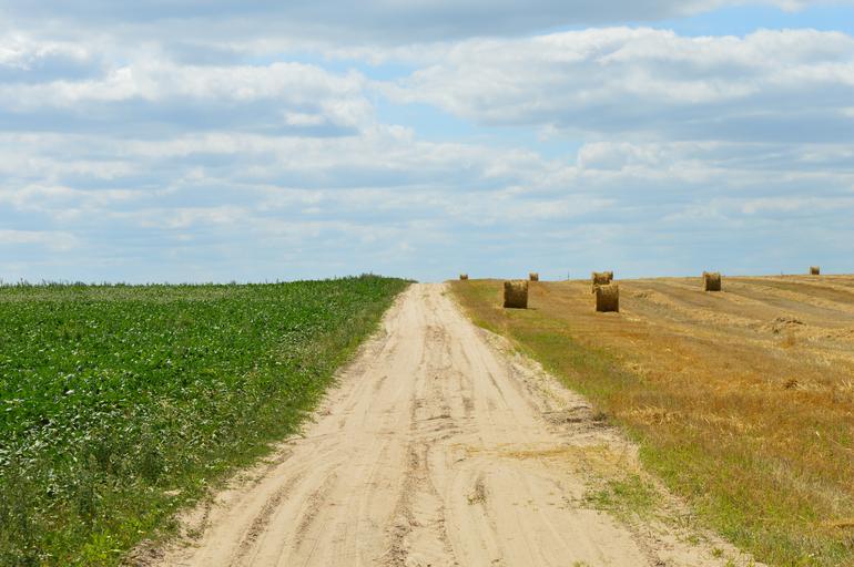 Keywords: wheat field agriculture harvesting straw bale a pile yellow farm stack sky road country green