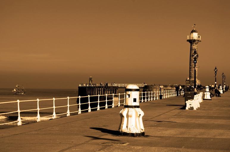 Keywords: whitby lighthouses town promenade city sea architecture background holidays sepia black white season fall water tourism trip coast history england