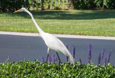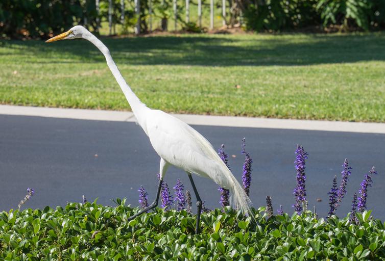 Keywords: white heron bird nature animal wildlife beak standing outdoors natural fauna purple flowers summer green wild