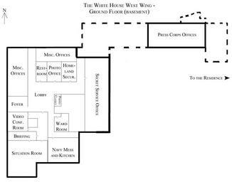 Keywords: White House West Wing Ground Floor.png A floorplan of the ground floor basement of the West Wing of the White House Note that depending on the administration some positions rooms may be used for different purposes than those shown here Image is not to scale Own 2007-08-22 Sarfa Floor plans of the White House Government buildings in Washington D C Rooms in the White House West Wing White House Situation Room