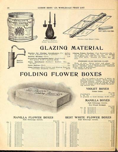| Keywords: Wholesale price list (16374004302).jpg 30 <br> CURRIE BROS ' CO WHOLESALE PRICE LIST <br> FOR <br> Scollay's Rubber <br> Putty Distributor <br> Peerless Glass Repair Clamp <br> GLAZING MATERIAL <br> Mastlca <br> Machine <br> Mastlca for Glazing Greenhonses ” Per gallon <br> 1 25; 6 gallons 7 00; 10 gallons 11 00 <br> Mastica Machine ” Each 1 25 <br> TTrenilovf's Old Elnirlish Putty ” Semi-liquid <br> Per gallon 1 25; 5 gallons 5 50 <br> Putty Distributor ” Scollay's Rubber 75c; <br> by mail 85c <br> Putty Knives ” Each 25c <br> Glass Cutters ” Steel Cutter and Glazing Tool 10c <br> Universal Diamond Cutter 5 00 <br> Glazing Points Peerless Van Reyper's ” No 2 <br> for single thick glass; No 2 for double; <br> thick glass; per 1 000 55c; by mail Oc-i <br> Per 5 000 2 50; Pincers for same 40c; by <br> mail G5c i <br> PEERLESS GLASS REPAIR CLAMP <br> Made of zinc Saves labor and glass No <br> more dropping out or sagging of cracked panes <br> Mends cracked glass immediately Adjusted <br> from inside of greenhouse <br> 150 clamps for 1 00 <br> FOLDING FLOWER BOXES <br> Do not neglect to state if white or <br> manila finish is wanted Write copy of <br> printing plainly Orders for 500 boxes <br> or more printed free of charge in one <br> color A charge of 1 00 made for print- <br> ing smaller lots <br> VIOLET BOXES <br> violet Color <br> Per 100 <br> 6 x3 x2 1 75 <br> 9 x5 x3 2 00 <br> If printed in Gold Bronze 1 00 extra <br> MANILLA BOXES <br> Full Telescope Covers <br> For Floral Designs <br> Per 100 <br> No 26 23x12x5 6 50 <br> 27 15x 15 x5 7 50 <br> 28 20x16x6 9 00 <br> 29 20x20x8 12 00 <br> 30 26x17x7 12 00 <br> No <br> 10 <br> 11 <br> 12 <br> 13 <br> 14 <br> 15 <br> 16 <br> 17 <br> 18 <br> 19 <br> «HI <br> MANILLA FLOWER BOXES <br> Full Telescope Covers <br> Per 100 <br> 7x5x3 1 20 <br> 9x5x3 1 40 <br> 12x5x3 – 1 60 <br> 15x5x3 1 85 <br> 18x5x3 2 15 <br> 12 X 6 X 3 1 90 <br> 15x6x3 2 35 <br> 18 x6 X 3 2 75 <br> 21 X 6 X 31 3 00 <br> 18 X 8 X 4 3 40 <br> 21x8x4 3 80 <br> 24x8x4 4 40 <br> 28x8x4 5 00 <br> 24 X 5 x 31/0 3 10 <br> 36x8x5 7 70 <br> 16x4x3 1 85 <br> 21x5x3 2 50 <br> 30x6x3 3 90 <br> 20x4x3 2 20 <br> BEST WHITE FLOWER BOXES <br> No <br> 10 <br> 11 <br> 12 <br> 13 <br> 14 <br> 15 <br> 16 <br> 17 <br> 18 <br> 19 <br> Full Telescope Covers <br> Per 100 <br> 7x5x3 1 60 <br> 9x5x3 1 80 <br> 12x5x3 2 00 <br> 15x5x3 2 25 <br> 18x5x3 2 50 <br> 12 X 6 X 3 2 35 <br> 15 X 6 X 3y2 3 00 <br> 18 X 6 X 3 3 70 <br> 21 X 6 X 31/2 4 15 <br> 18x8x4 4 60 <br> 21x8x4 5 10 <br> 24x8x4 5 65 <br> 28x8x4 6 90 <br> 24 X 5 X 3'/2 4 20 <br> 36x8x5 10 00 <br> 16x4x3 2 40 <br> 21x5x3 3 40 <br> 30 X 6 X 3 5 20 <br> 20x4x3 2 60 <br> JL 42212805 133036 66130 Page 30 Text http //www biodiversitylibrary org/page/42212805 1905 10 5962/bhl title 66130 Currie Brothers Company ; Henry G Gilbert Nursery and Seed Trade Catalog Collection Biodiversity Heritage Library Currie Bros Co Wholesale price list autumn 1905 Garden Stories Bulbs Plants Catalogs Equipment and supplies Flowers Gardening Nurseries Horticulture Plants Ornamental Seeds U S Department of Agriculture National Agricultural Library bhl page 42212805 dc identifier http //biodiversitylibrary org/page/42212805 bhlGardenStories BHLinbloom bulbs plants nurseries horticulture plants ornamental u s department of agriculture national agricultural library bhlgardenstories bhlinbloom Information field Flickr posted date ISOdate 2015-01-26 CC-BY-2 0 BioDivLibrary https //flickr com/photos/61021753 N02/16374004302 2015-08-25 05 53 50 cc-by-2 0 PD-old-70-1923 Wholesale price list Photos uploaded from Flickr by Fæ using a script |