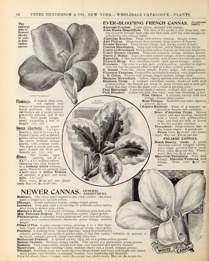 Keywords: Wholesale price list of requisites for florists and market gardeners (16154164354).jpg 14 PETER HENDERSON CO NEW YORK ” WHOLESALE CATALOGUE ” PLANTS <br> The <br> natural <br> size of <br> flowers <br> shown <br> in cuts <br> is four <br> inches <br> across <br> EVER-BLOOHING FRENCH CANNAS <br> CAN NA FLAMINGO <br> Flamingo A su P erb - dee P crim - <br> ” ” '- son variety with <br> trusses of immense size borne in <br> lavish profusion The individ- <br> ual flowers are 4 inches across <br> gracefully reflexed and of fine <br> form Dark green foliage <br> rarely exceeding 4 feet in <br> height See cut <br> Queen Charlotte \ÂĢ „Ēt <br> flowered ever-b looming <br> French Canna with a distinct <br> golden belt around each petal <br> the centre brilliant orange <br> scarlet with crimson tones <br> The plant is sturdy and com- <br> pact; flowers are stout and <br> densely set See cut <br> / The trusses upon <br> lUaCe opening are of a <br> delicate sulphur-yellow <br> changing very soon however <br> to a creamy white without <br> spots Plants in our grounds were <br> a solid mass of white flowers <br> all summer a grand and novel <br> sight See cut <br> Price roots 8 00 per 100; plants <br> ready May 1st 2 00 per doz <br> STANDARD <br> SORTS <br> Admiral Courbet Light yellow speckled with orange <br> Alba Rosea Grandiflora The base of the petals is rich deep rose tint- <br> ing upwards through light rose into flesh pink until the color merges im- <br> perceptibly into creamy white <br> Alphonse Boufier Deep rich velvety crimson Height 6 feet <br> Ami Pichon Magnificent deep crimson large trusses of flowers <br> Bronze Bedder Deep bronze foliage rich orange scarlet flowers <br> Charles Henderson Deep rich crimson yellow flame at the throat <br> Comte de Bouchaud Rich golden yellow heavily spotted with bright red <br> Comte Horace Choisel Deep rich magenta ; strong compact grower <br> Doyen J Sisley Dark chocolate-colored foliage flowers orange scarlet <br> Egandale A fine dark-foliaged variety with flowers of a soft currant red <br> Edward Mieg Rich vermilion scarlet ; dark green foliage 3 feet <br> Eldorado The color is a rick pure golden-yellow speckled so slightly <br> with red that the general effect is that of a pure golden yellow <br> E Renan Four feet leaves purple flowers large rich rose-carmine <br> Florence Vaughan Deepyellow mottledrichcrimson very large flowers <br> J D Cabos Flowers rich orange tinged apricot; foliage dark <br> Madame Monteflore \ ellow slightly spotted with red very attractive <br> Madame Crozy A brilliant vermillion scarlet bordered with deep <br> golden-yellow ; the flowers are borne in great clusters and in such pro- <br> fusion that they crown the plant with a blaze of glowing color <br> Paul Marquant A peculiar shade of salmon overlaid with soft carmine <br> PinkEhmanii A pure rose pink fine habit ; very free blooming ; 4 feet <br> Pres Carnot A majestic variety with dark <br> foliage ; flowers deep scarlet <br> Rose Unique Beautiful rose color vigorous <br> growth ; 3 feet <br> Sophie Buchner Plant of a majestic ap- <br> pearance flowers rich vermilion <br> Souy d'Antoine Crozy Intense <br> scarlet rich and dazzling bordered <br> with a broad rich golden-yellow <br> edge and does not fade or scorch <br> in the hot and dry weather <br> Trocadero Deep crimson lake of <br> the richest shade A grand sort <br> Price roots 4 00 per 100 ; plants <br> ready May 1st 10 00 per 100 <br> FOLIAGE CANNAS <br> Black Beauty true A grand <br> chocolate-colored foliaged variety <br> wavy edges ; grows 6 feet or more <br> Price roots 2 50 per doz ; Plants <br> ready May 1st 3 50 per doz <br> Marechal Vaillainte Very dark <br> foliage; Discolor Violacea dark <br> foliage Price roots 3 00 per <br> 100 <br> NEWER CANNAS GENERAL <br> ASSORTMENT <br> Brilliant The three upper segments are clear yellow; the lower <br> petal is bright red spotted yellow <br> Chicago Grand vermilion scarlet; foliage bright green <br> Lorraine Pure pink with a broad edge of primrose-yellow fading <br> after noon to almost pure white <br> Maiden's Blush A new color inCannas absolutely pure shell-pink <br> Mrs Fairman Rogers Rich vermillion scarlet edged yellow <br> Philadelphia A splendid bright glowing red very rich and velvety; <br> an early and constant bloomer handsome green foliage medium <br> height <br> Pillar of Fire A giant among Cannas growing 6 to 7 feet high; <br> very bright scarlet; flowers large and borne on strong erect spikes <br> Premier A seedling from Queen Charlotte much more brilliantly <br> colored and has the pronounced golden edge of that fine variety <br> its dwarf compact growth rarely exceeding three feet <br> Richmond Pearson A spotted variety light red on a golden-yellow ground <br> Robert Christie Brilliant orange scarlet This variety is a particularly strong grower <br> Rosalba Fine cream-white dotted with rose; very beautiful and entirely distinct <br> Tarrytown An ideal bedding Canna brilliant cherry-red a dwarf compact grower <br> Triumph Flamingo type but more vigorous larger flower and truss; rich bright red ; broad <br> thick petals very durable ; a constant bloomer ; very handsome and desirable <br> Price for above Newer Cannas roots 10 00 per 100; plants ready May 1st 2 00 per doz <br> valuable on account 45173010 160879 84546 Page 14 Text http //www biodiversitylibrary org/page/45173010 1899 Henderson Peter Co ; Stumpp Walter Co New York N Y Biodiversity Heritage Library Wholesale price list of requisites for florists and market gardeners / 1897-1913 Garden Stories Catalogs Henderson Peter Co New York New York State Nurseries Horticulture Nursery stock Seed industry and trade Seeds Stumpp Walter Co New York N Y Mertz Library The New York Botanical Garden bhl page 45173010 dc identifier http //biodiversitylibrary org/page/45173010 bhlGardenStories Flowers Bulbs Vegetables Cannas BHLinbloom henderson peter co new york new york state nurseri