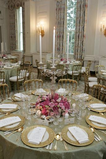 Keywords: WHStateGWB.jpg Table setting in White House State Dining Room from whitehouse gov site PD-USGov State Dining Room Formal meals Table settings Floral table decorations White House china of the Bill Clinton administration