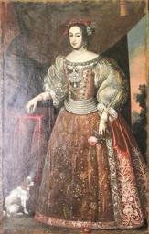 Keywords: Wife of Count Ferenc Esterházy, Ilona Illésházy.jpg author century 17 oil on canvas Institution Hungarian National Museum Budapest object history From the ancestral gallery of the Nádasdy family credit line accession number own ; Photo by Szilas in the Hungarian National Museum Commonist PD-old-100 17th-century unidentified painters Paintings in the Hungarian National Museum Nádasdy family House of Esterházy 17th-century portrait paintings not categorised by year F 17th-century oil on canvas paintings in Hungary 17th-century oil portraits of standing women at full length 17th-century portrait paintings with dogs Oil paintings of dogs Portrait paintings of women holding flowers Portrait paintings of women with dogs National costumes of Hungary in portrait paintings