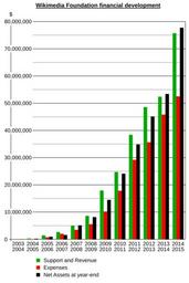 MAKE A MEME View Large Image Wikimedia Foundation financial development multilanguage.svg translate yes Financial development of the Wikimedia Foundation legend green Support and Revenue red Expenses black Net assets at year-end Dévelopement financier de la Wikimedia ...