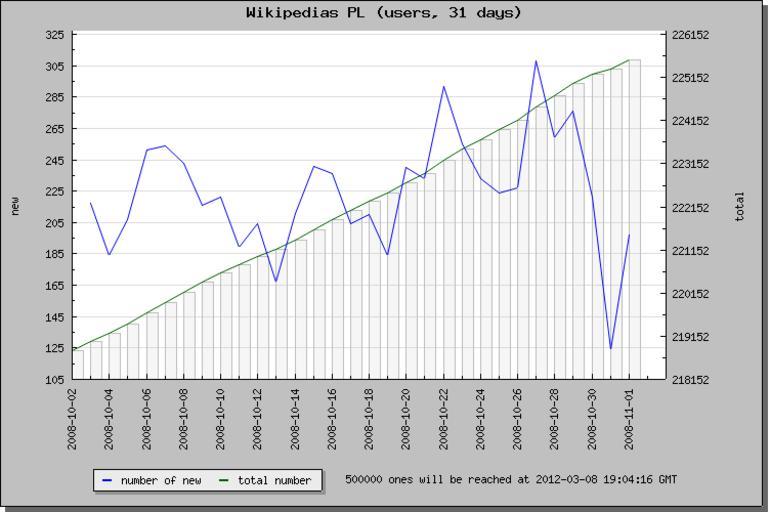 | Keywords: Wikipedyści pl 10.08.png en growth of number of registred users in pl Wikipedia in October 2008 pl przyrost liczby zarejestrowanych użytkowników w polskiej Wikipedii w październiku 2008 http //wikisupport martinkozak net/~martinkozak/statistics/ sreenshot by Przykuta <span class signature-talk >talk</span> 01 XI 08 Disclaimer on the wikisupport page - Written by Martin Kozák older data based on data from Mutante's statistics system hosted by courtesy of Petr Adámek and Wikimedia Toolserver Thanks to Danny B Complete tables are available here Everything is public domain Polish Wikipedia statistics |